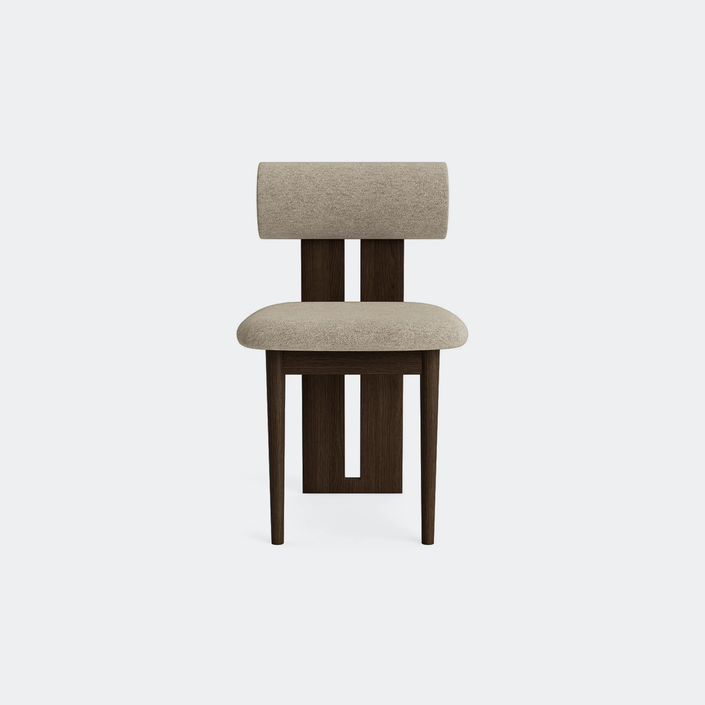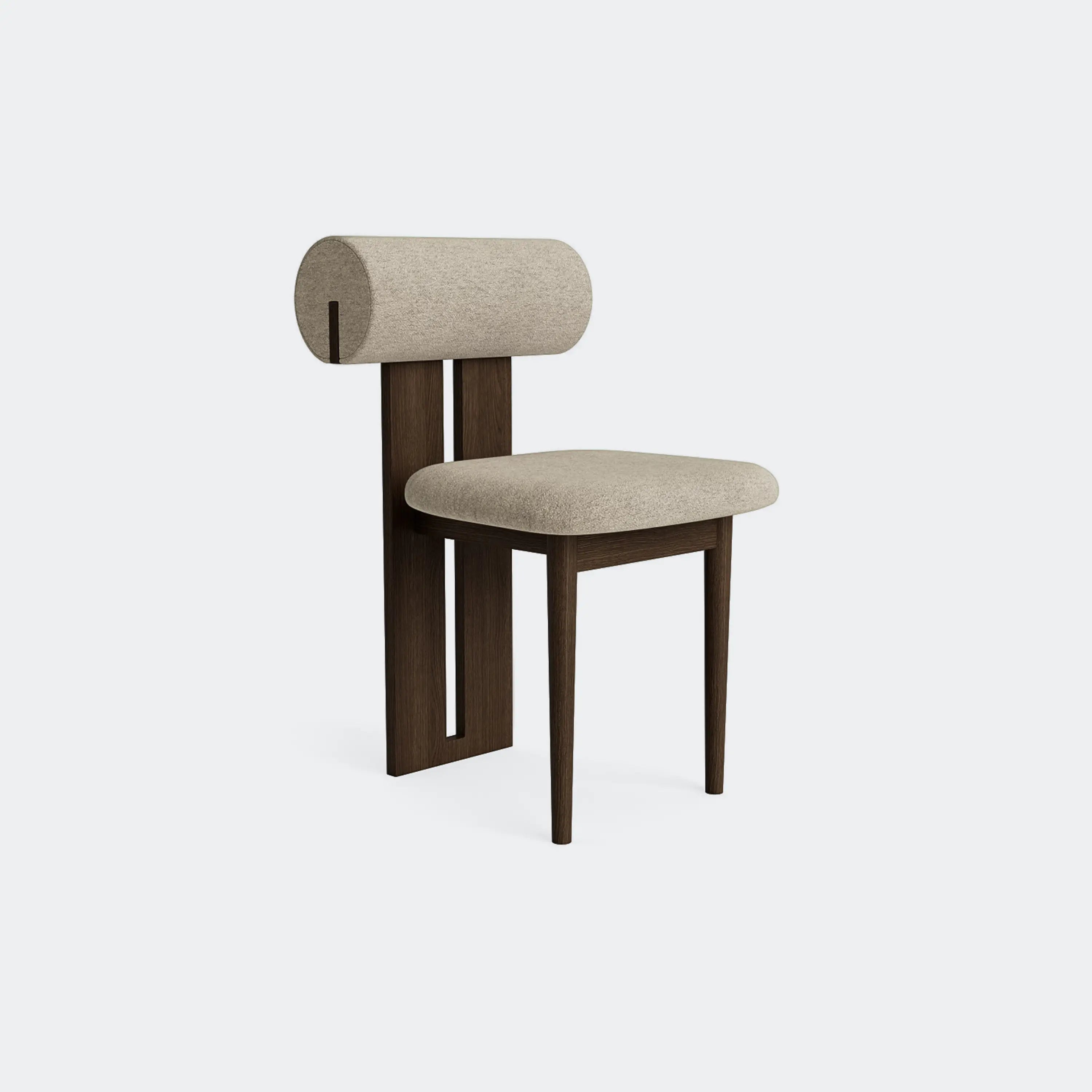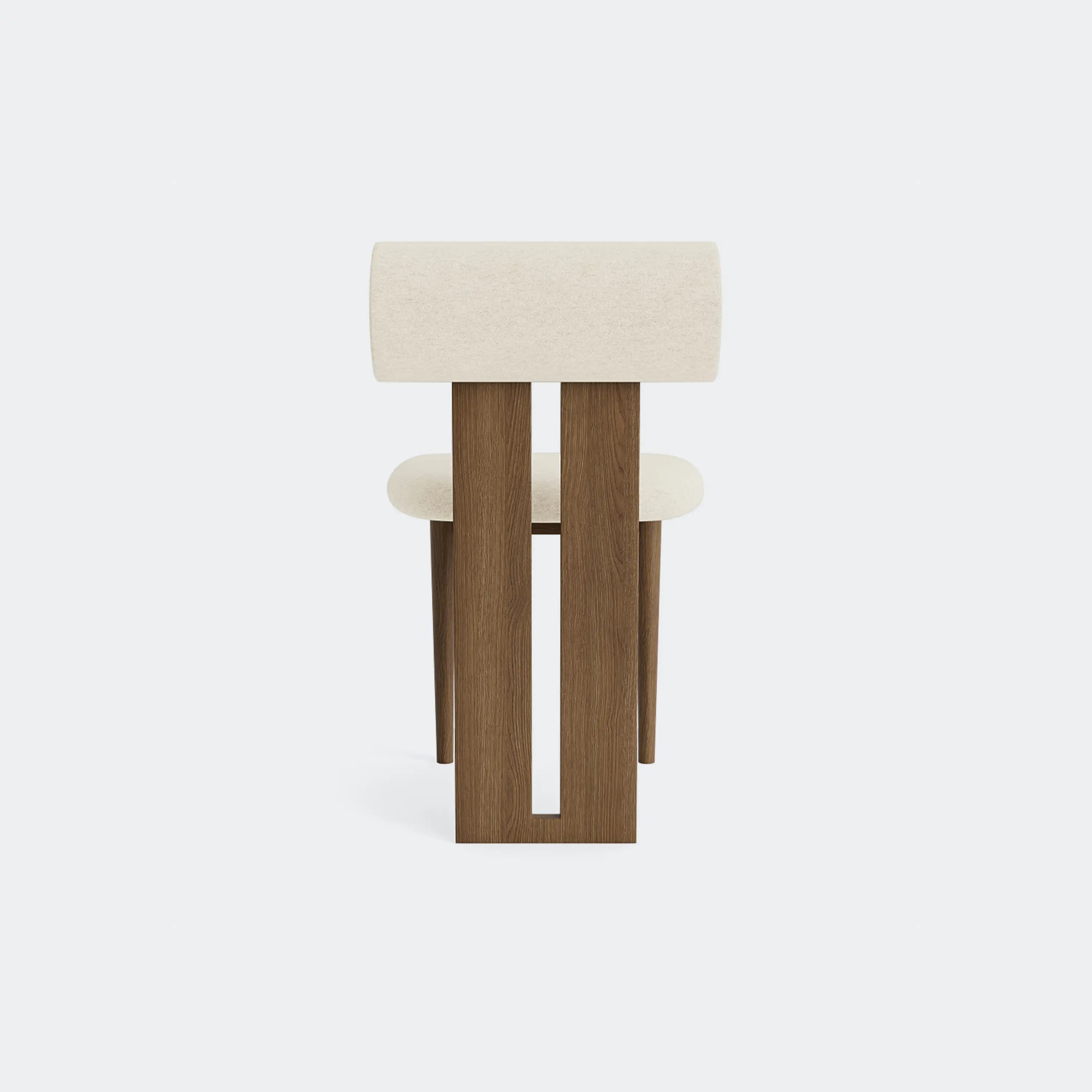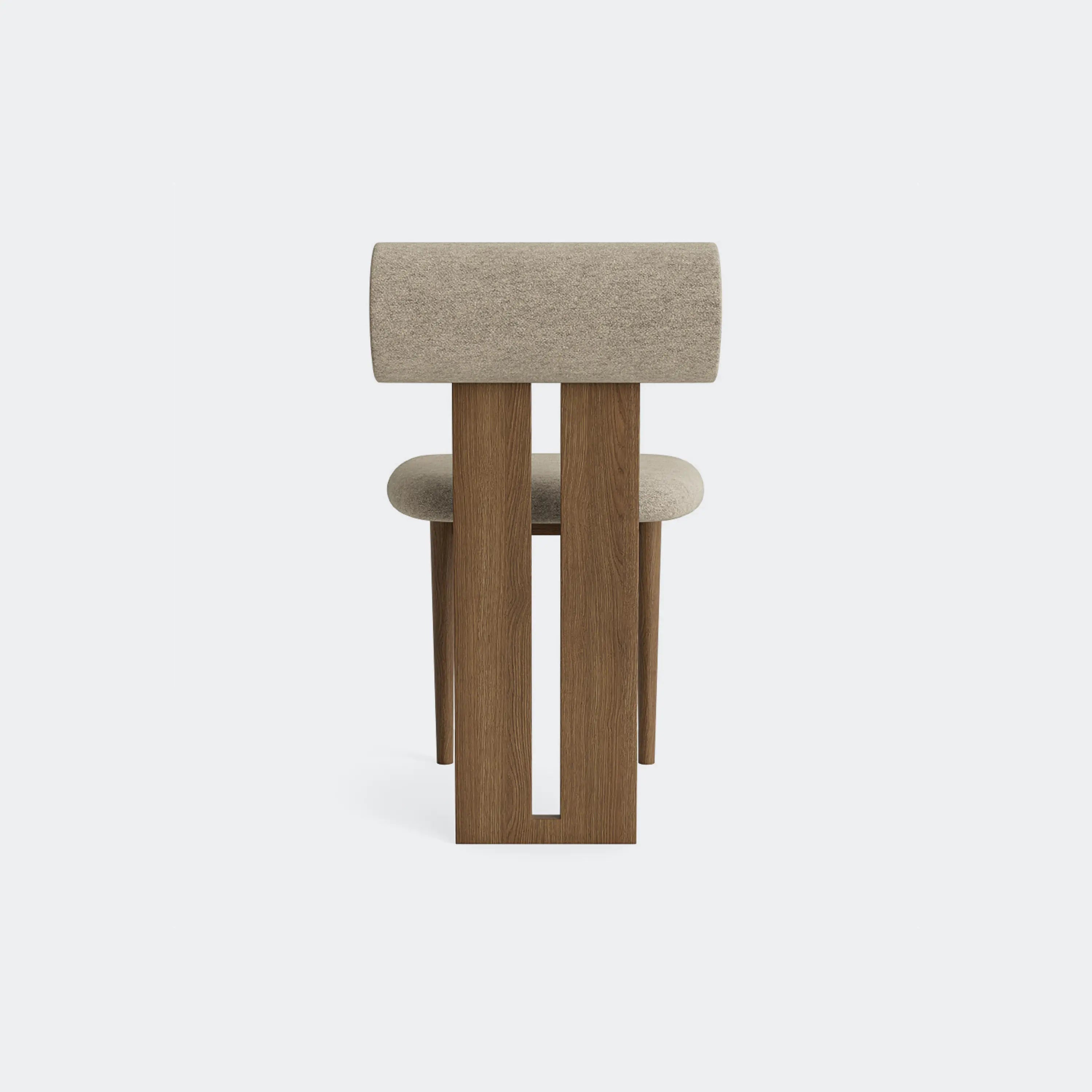 The Norr11 Hippo Dining Chair draws inspiration from the rounded proportions of its namesake, balancing a sculpted wooden frame with generously upholstered seating. Its expressive backrest floats above the seat, adding visual lightness to a bold, grounded form.