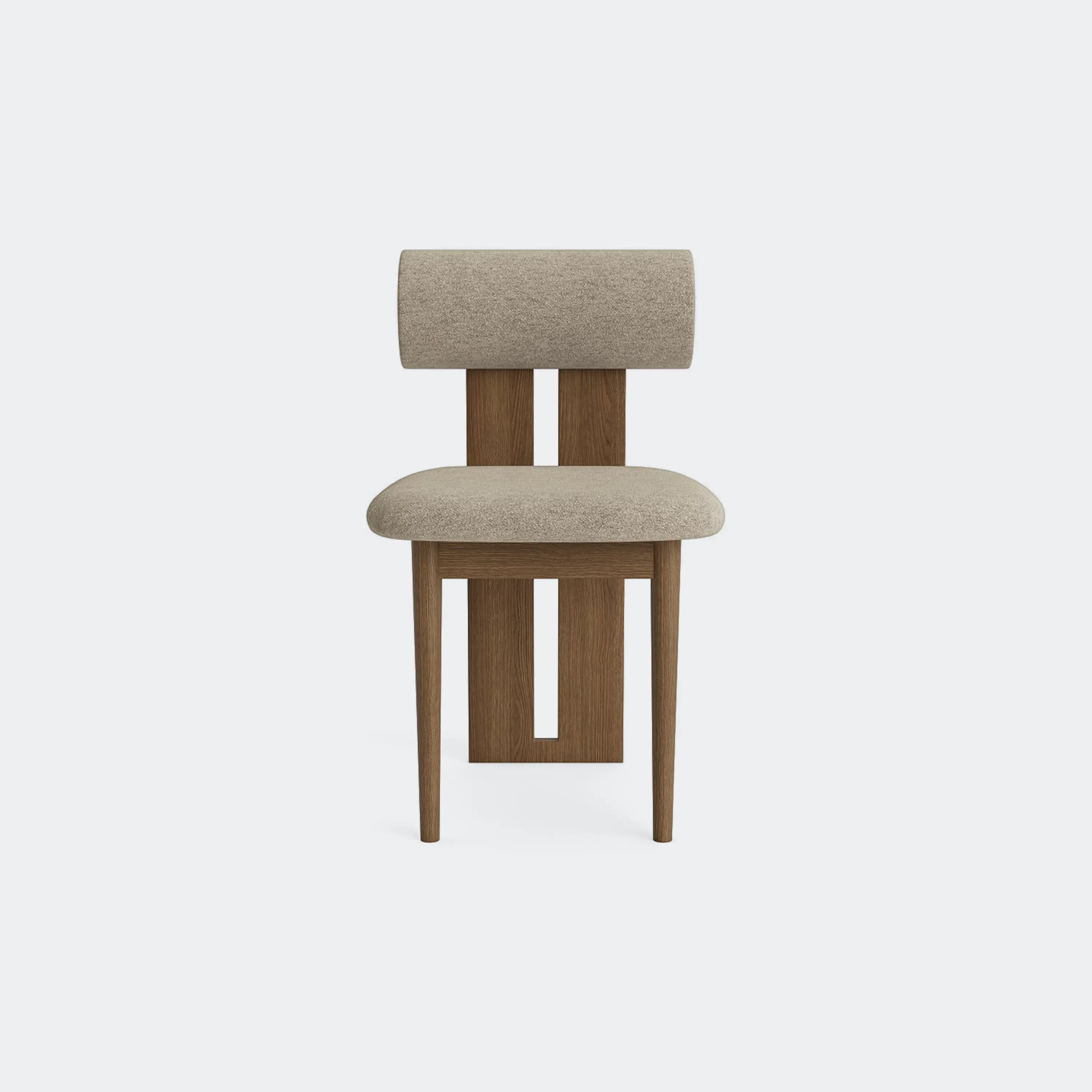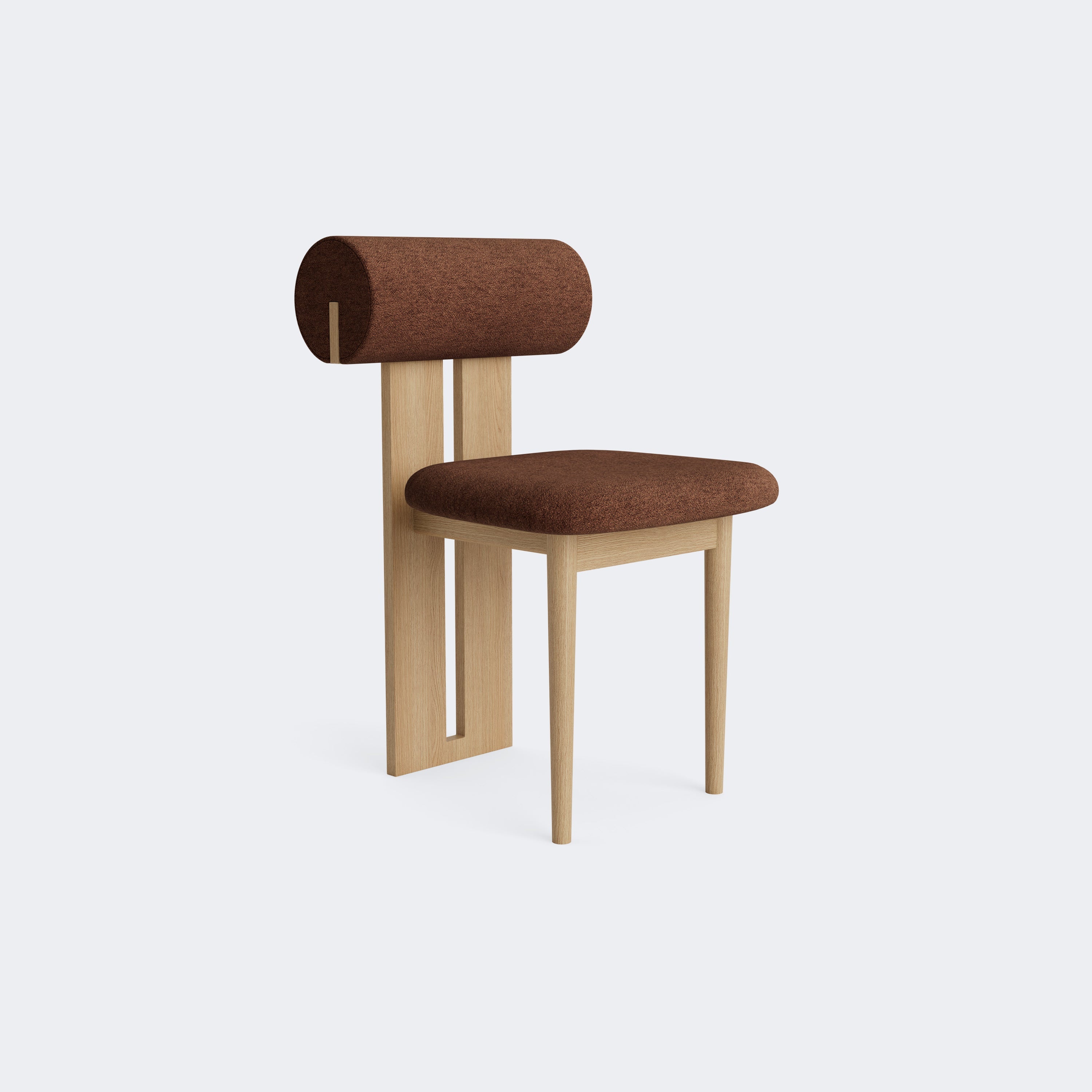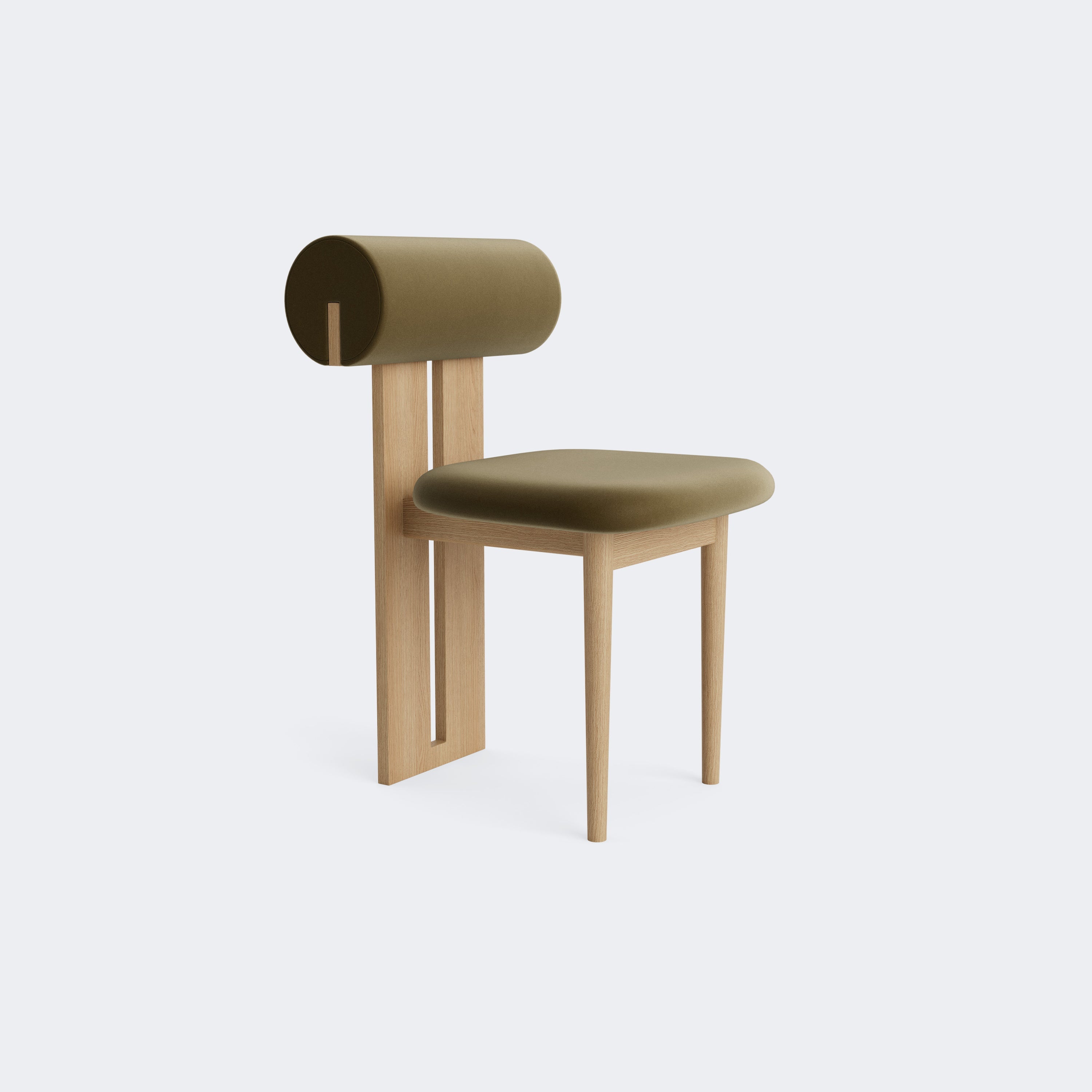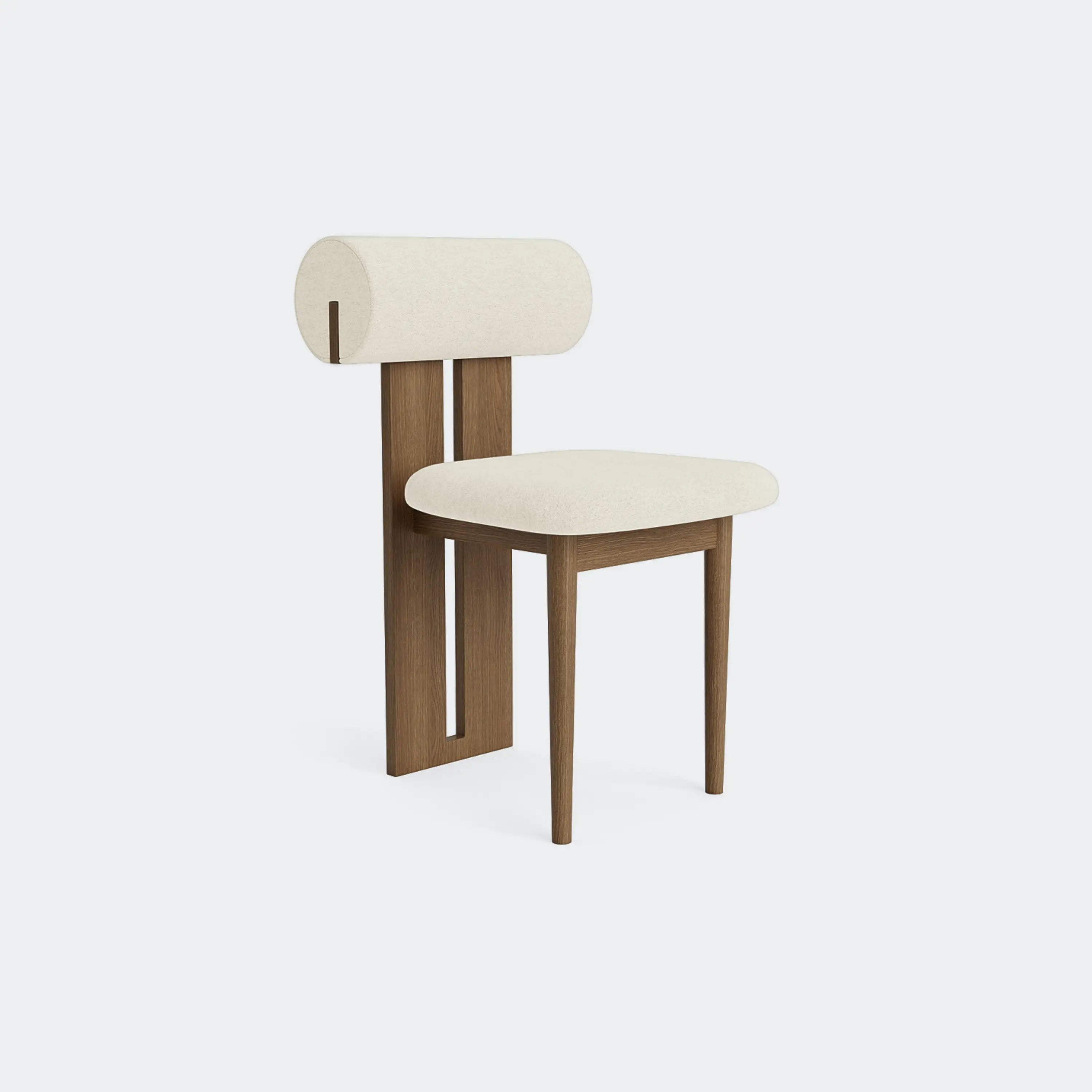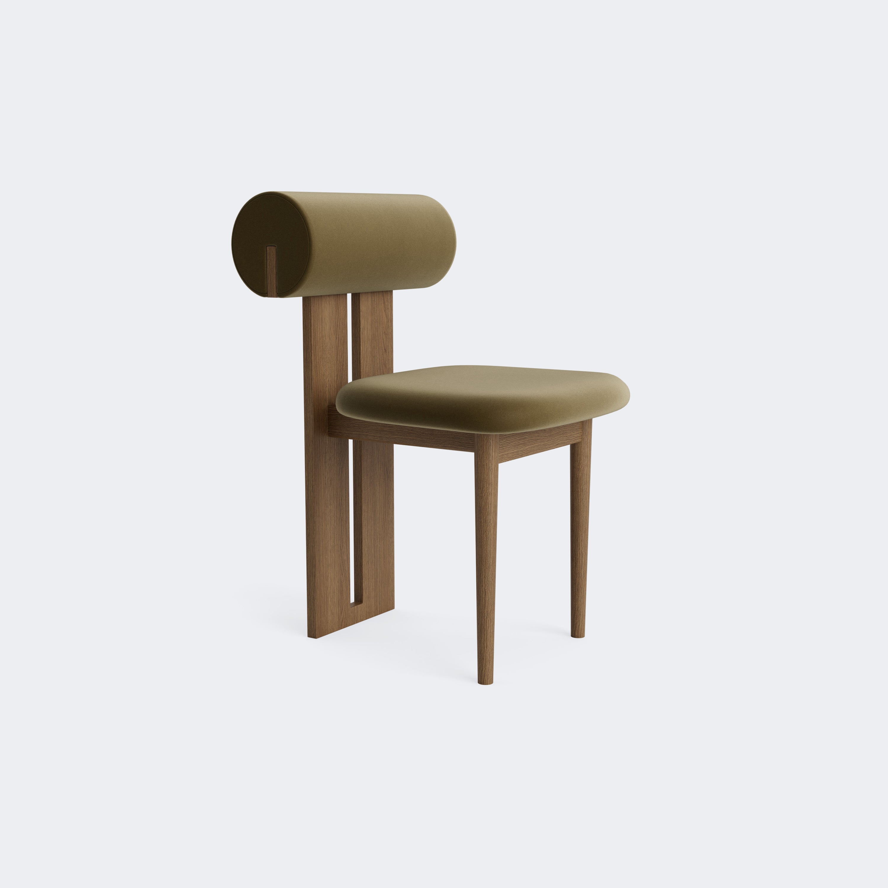 The Norr11 Hippo Dining Chair draws inspiration from the rounded proportions of its namesake, balancing a sculpted wooden frame with generously upholstered seating. Its expressive backrest floats above the seat, adding visual lightness to a bold, grounded form.