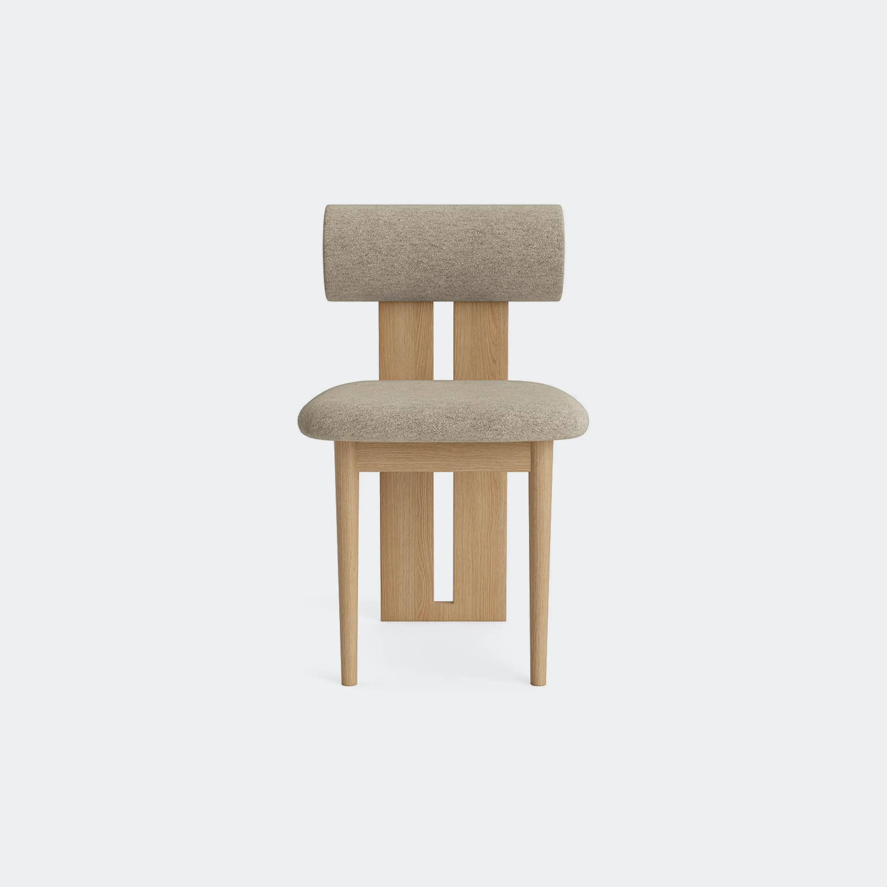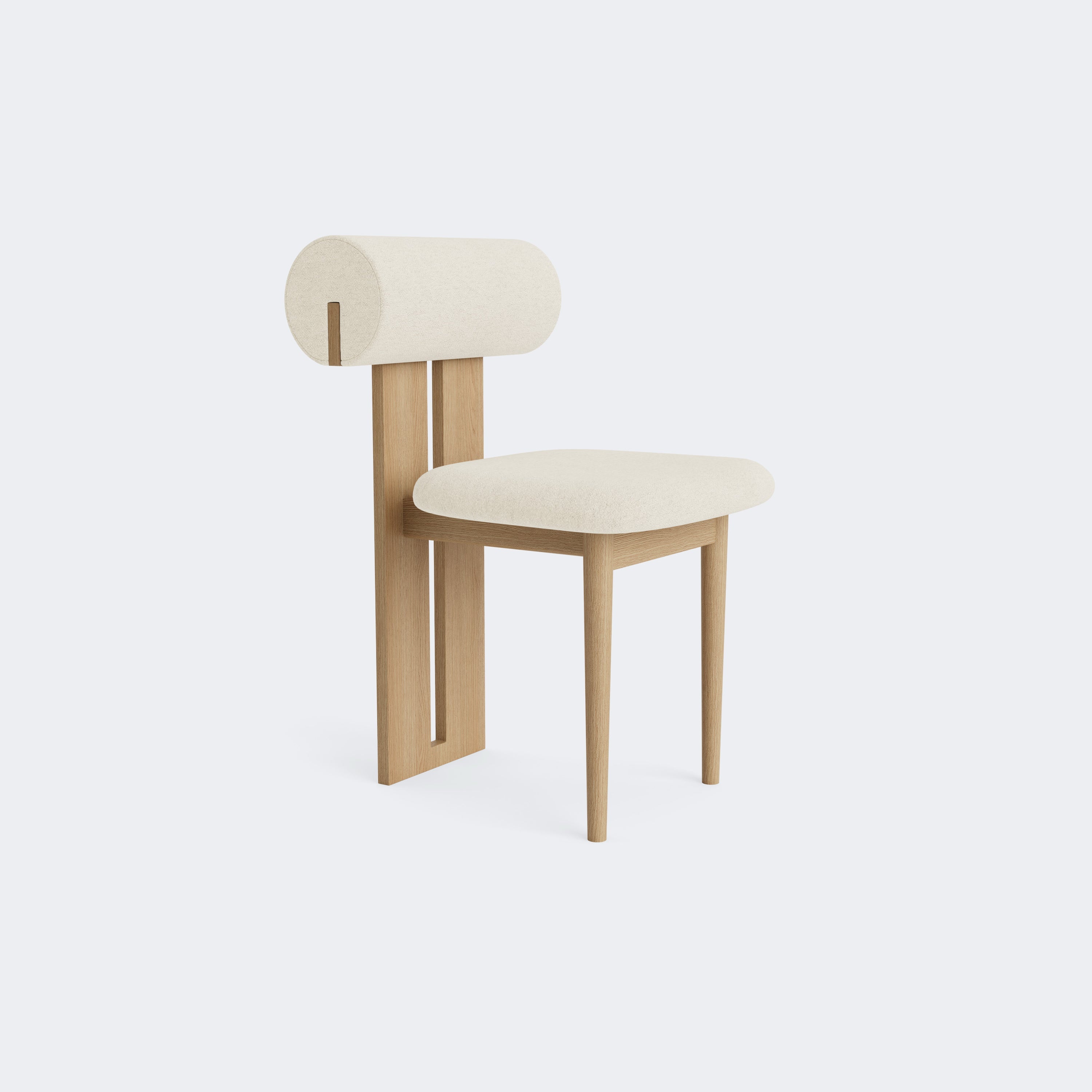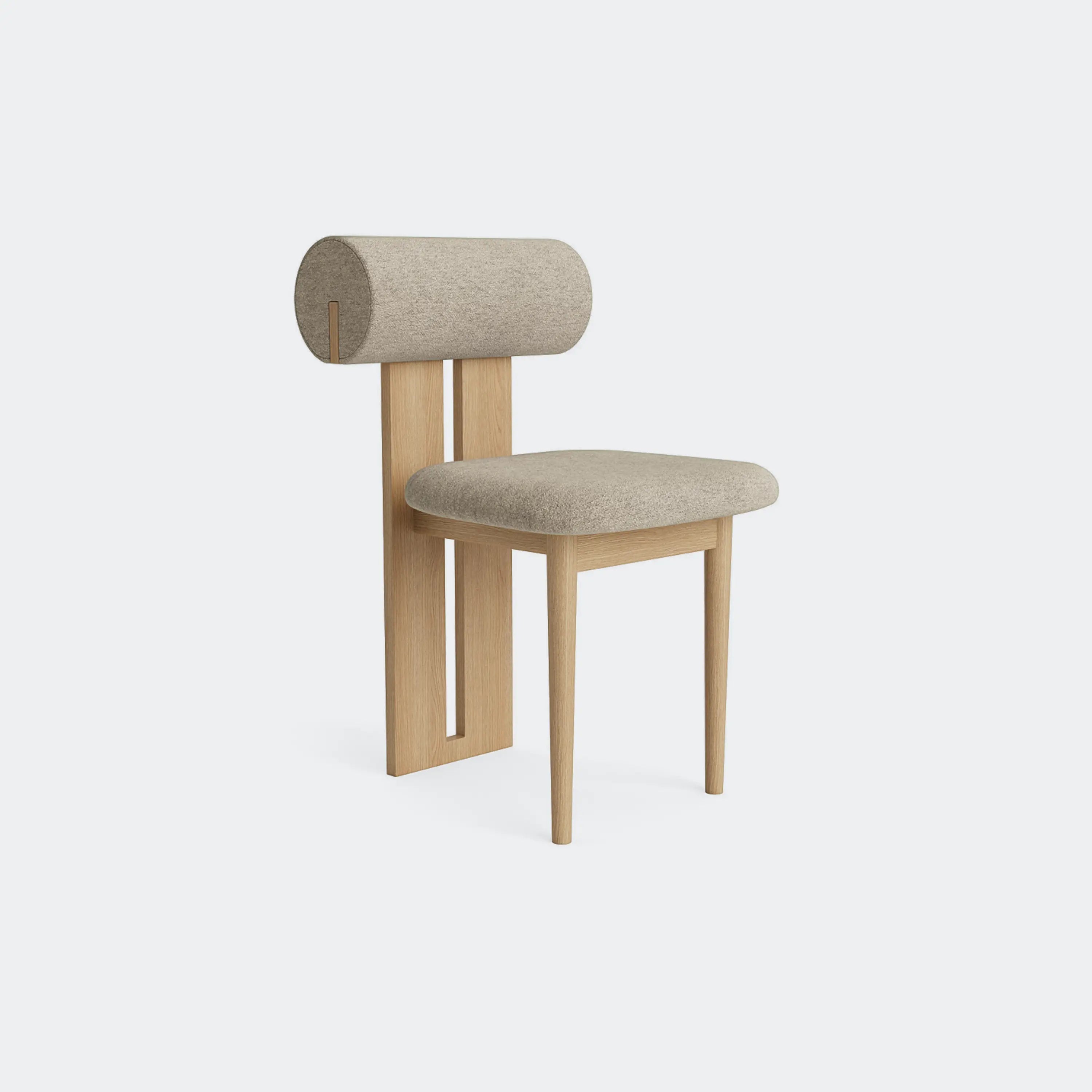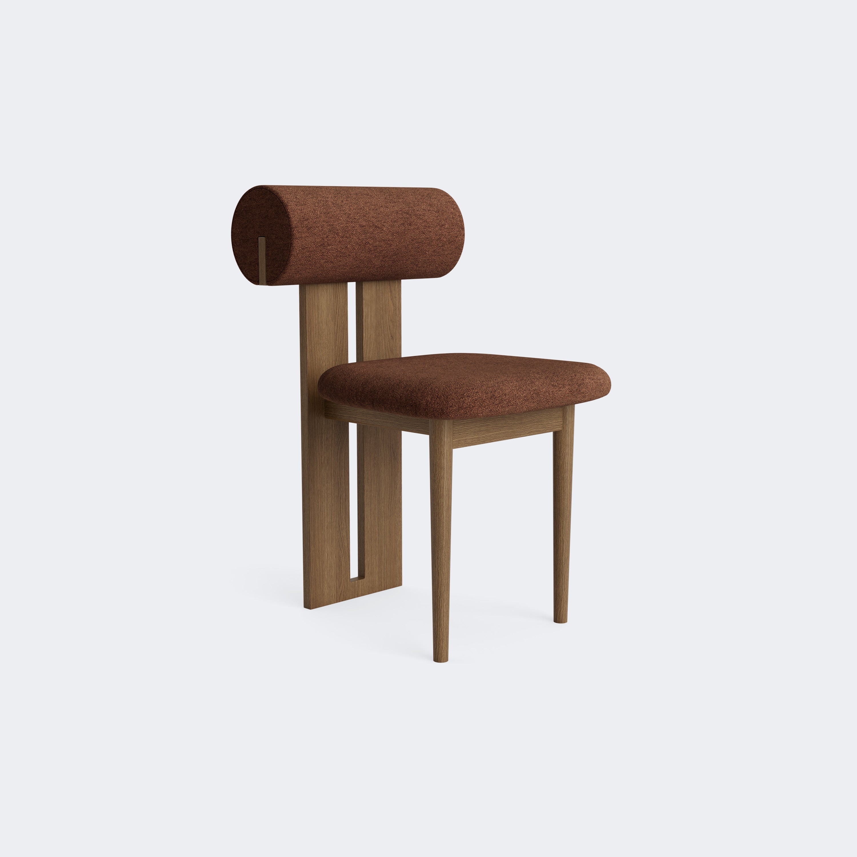 The Norr11 Hippo Dining Chair draws inspiration from the rounded proportions of its namesake, balancing a sculpted wooden frame with generously upholstered seating. Its expressive backrest floats above the seat, adding visual lightness to a bold, grounded form.