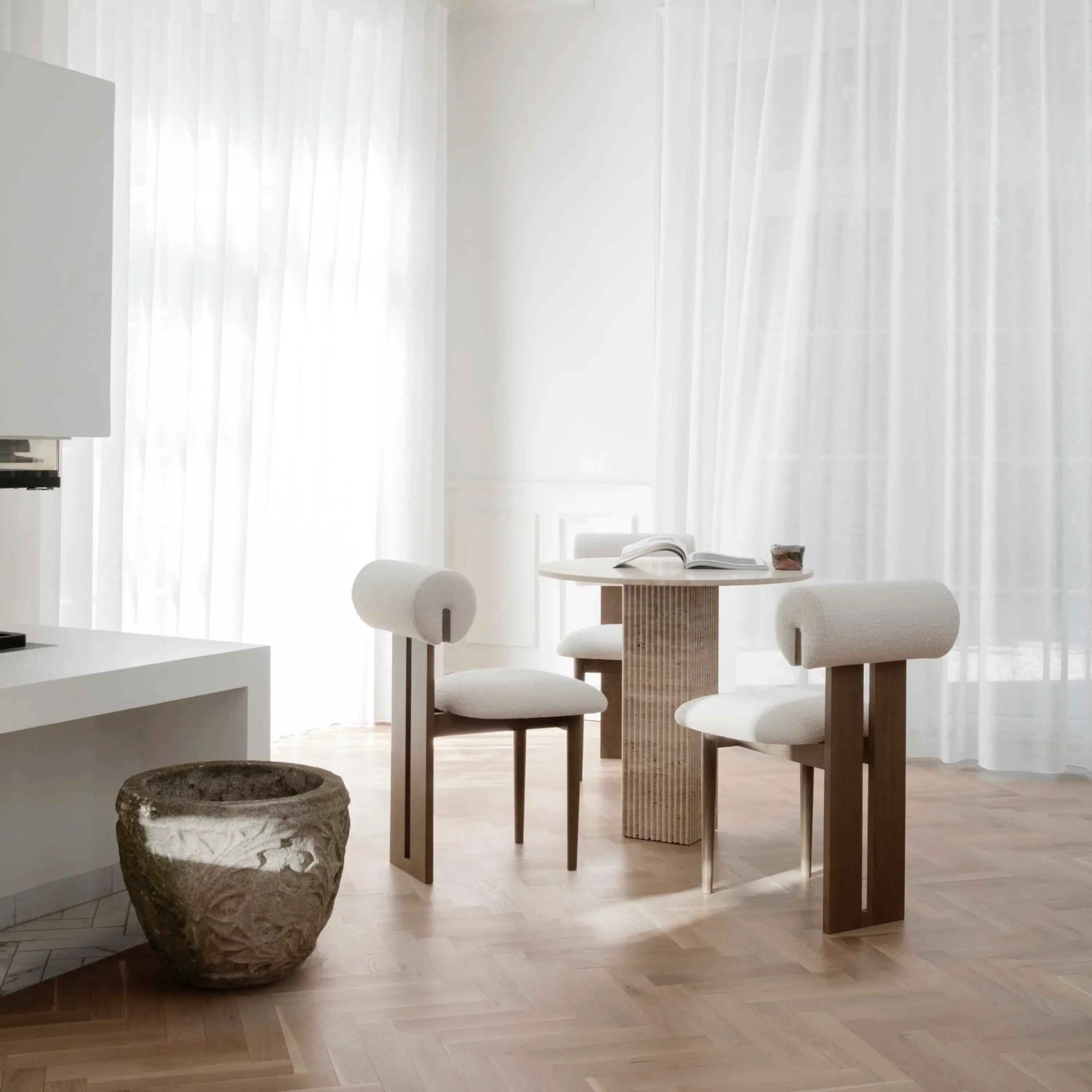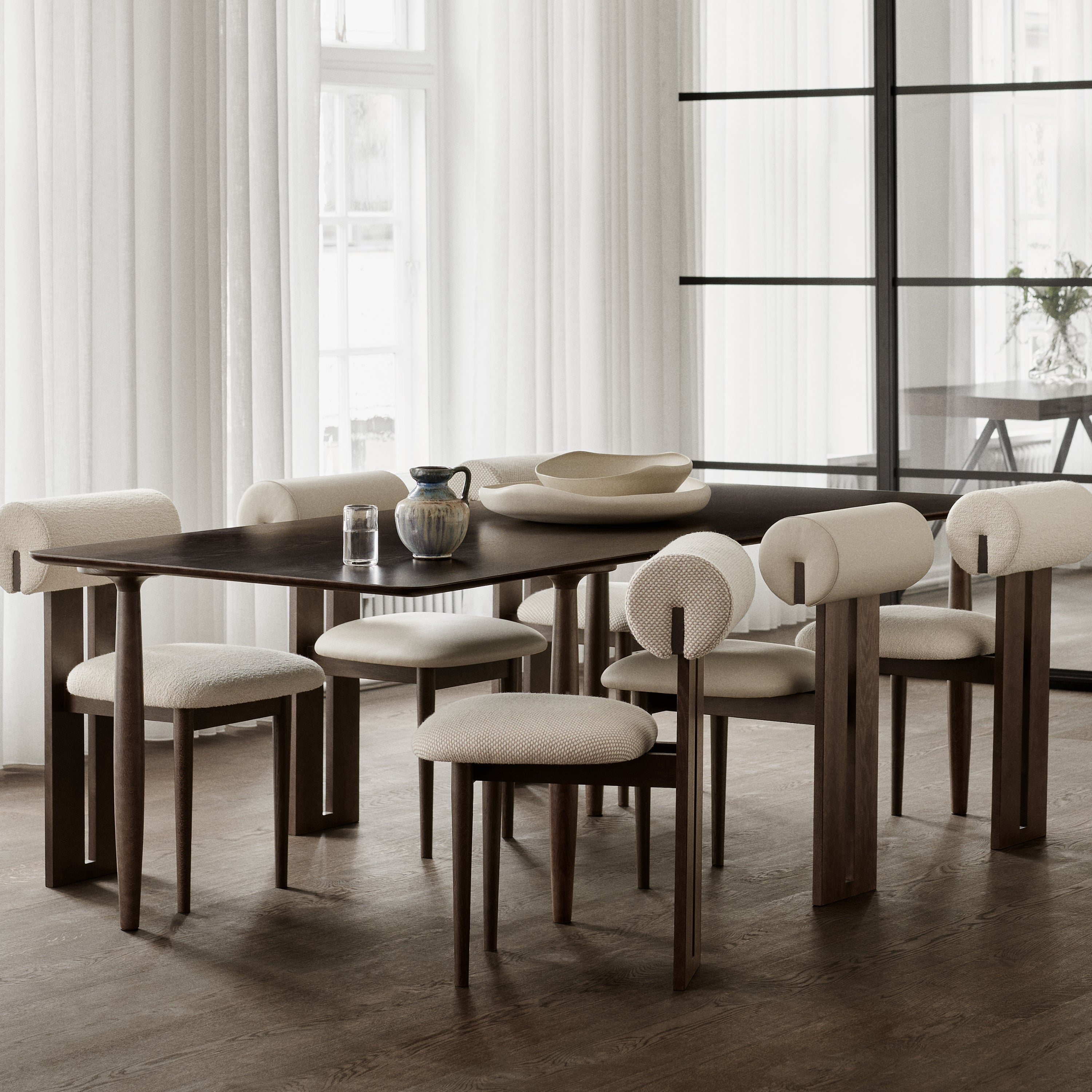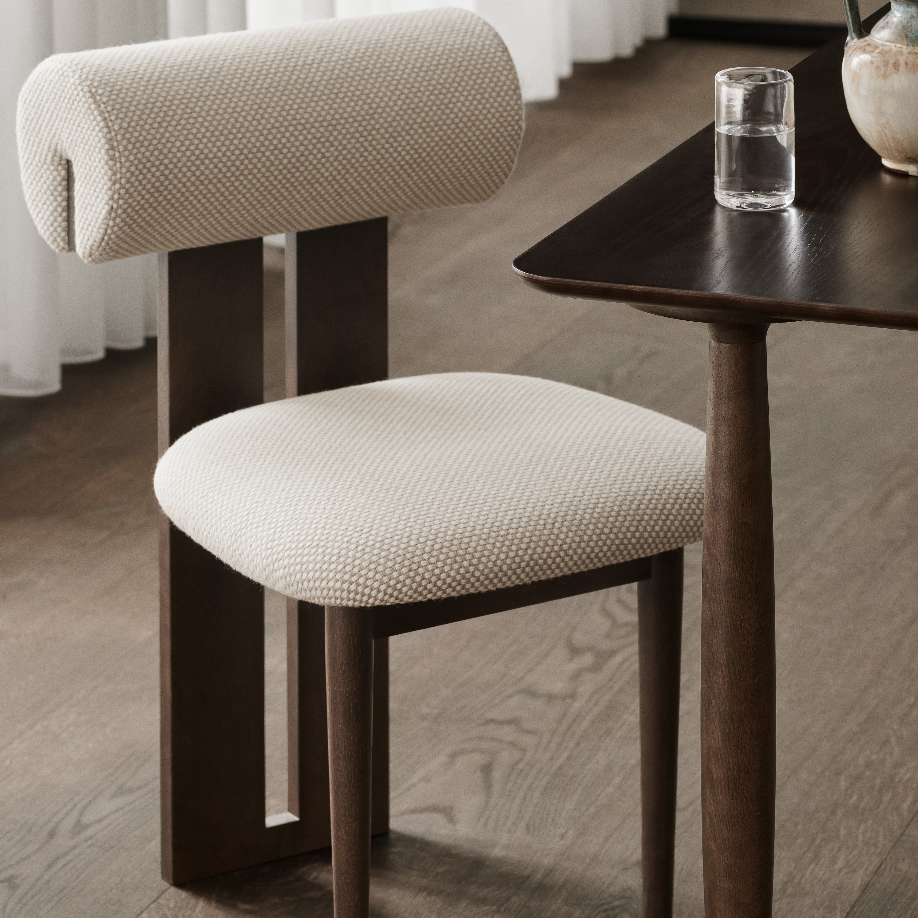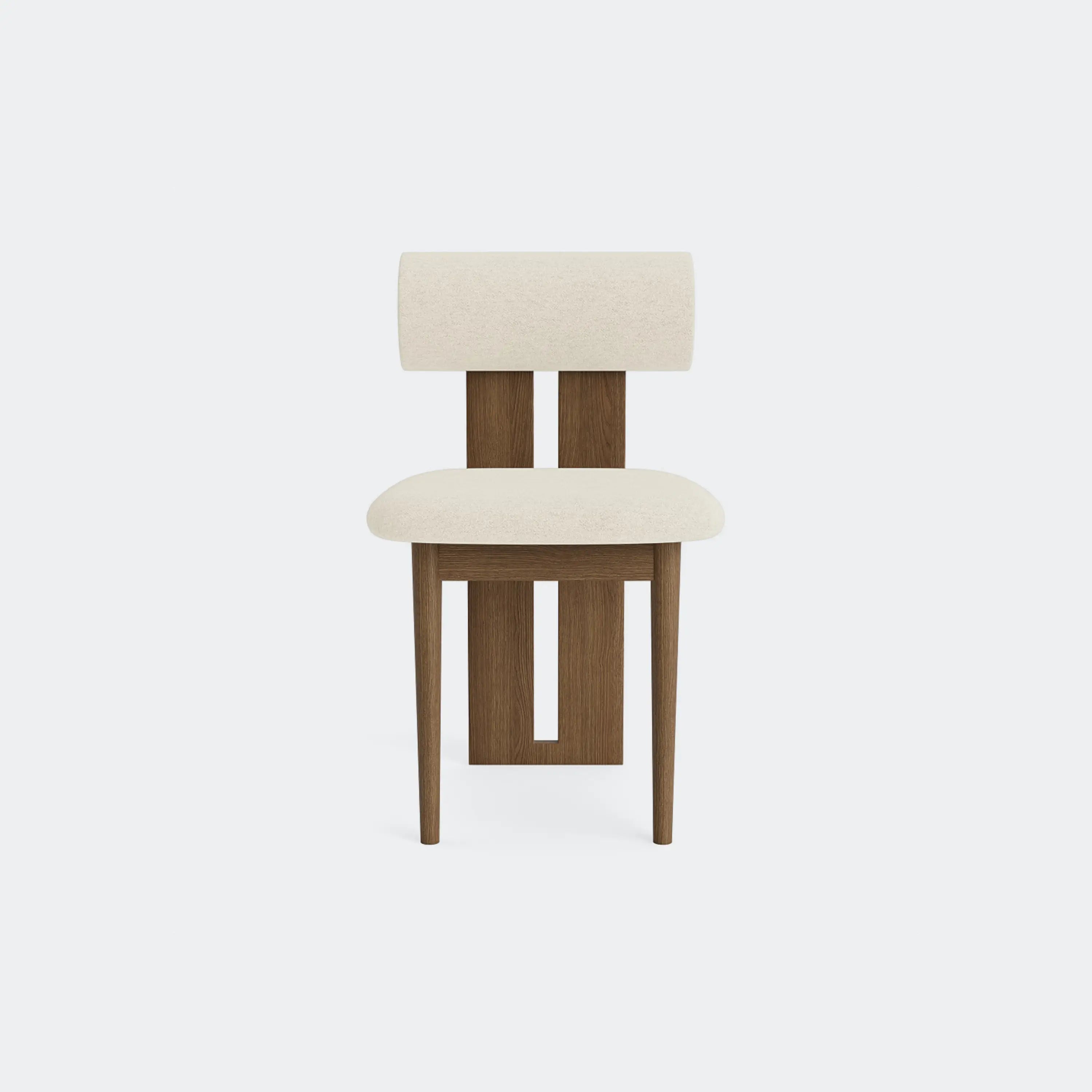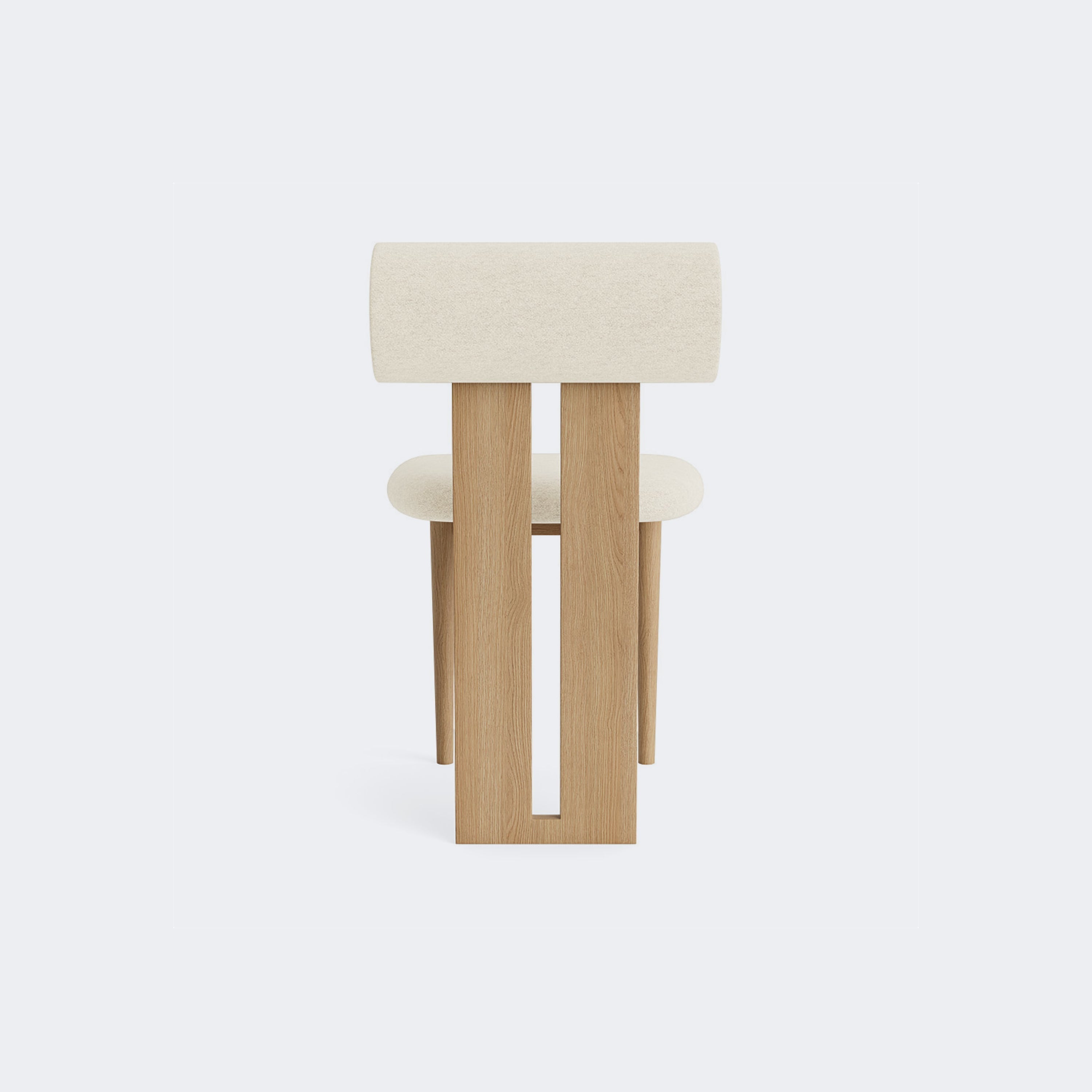 The Norr11 Hippo Dining Chair draws inspiration from the rounded proportions of its namesake, balancing a sculpted wooden frame with generously upholstered seating. Its expressive backrest floats above the seat, adding visual lightness to a bold, grounded form.
